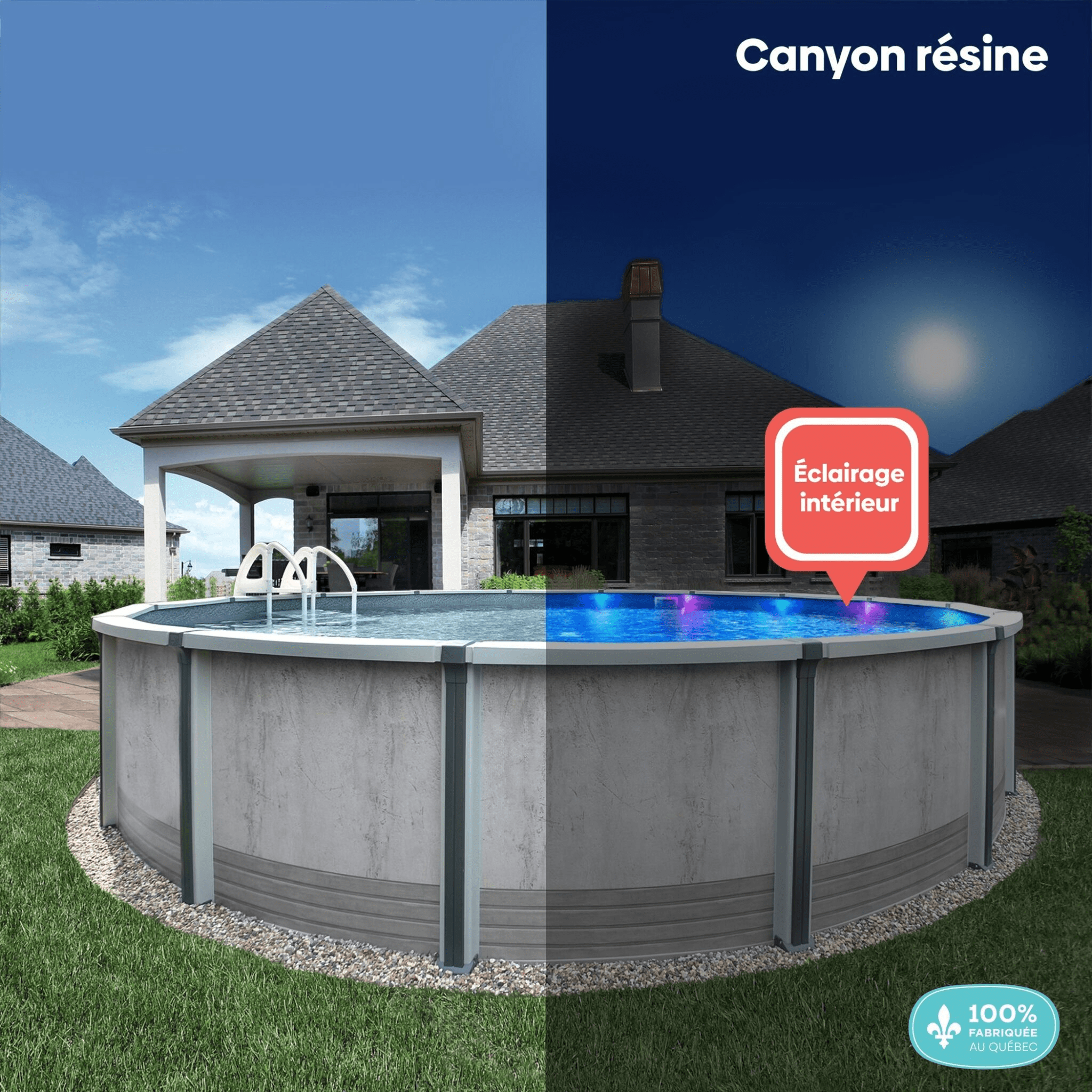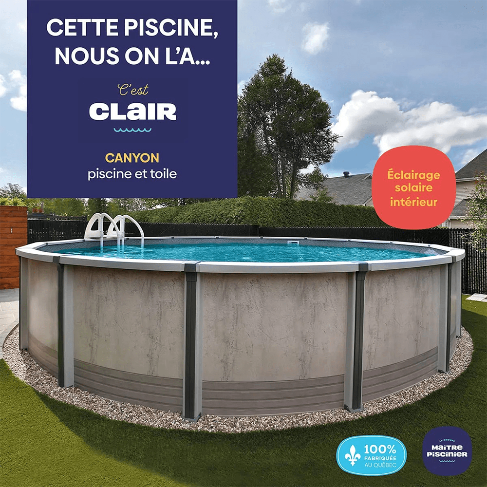Nouveauté: Éclairage solaire à sept couleurs intégrés aux margelles illuminant l’intérieur de votre piscine (en option) Fièrement fabriquée au Québec.
